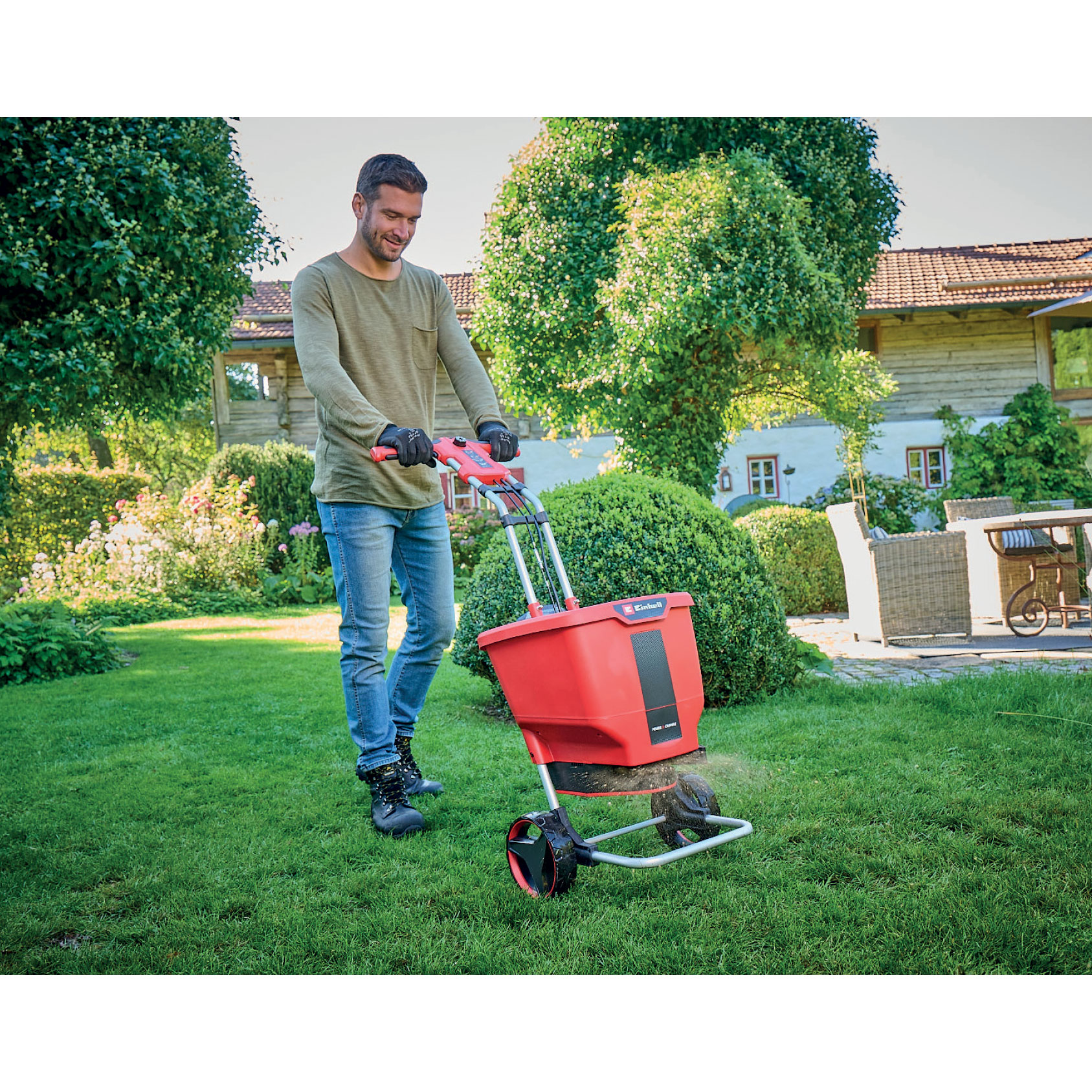 The Einhell cordless multi-purpose spreader 3415440 (GE-SR 18/22 Li-Solo) is not only suitable for lawn care in the summer months, but also in winter in the fight against icy paths and driveways. As a member of the Power X-Change family, the multi-purpose spreader can be combined with all Power X-Change batteries and chargers. Due to the energy of the battery, the spreading material – no matter whether road salt, seeds or fertiliser – is automatically distributed on the ground. The spreading rate can be regulated in 8 stages and the spreading speed can be adjusted in 6 levels using the electronic speed control. The spreading width can be set as desired between 4.9 ft. and 19.6 ft. to adapt the tool to the area to be treated. The tank can hold up to 22 litres of material to be spread, and thus offers a high capacity to cover large areas. Thanks to the large wheels, lightweight, ergonomic push bar made of aluminium, and the Softgrip handle, the cordless multi-purpose spreader can be optimally guided so that the spreading material is evenly distributed. The tool does not include a battery or a charger. These accessories are available separately.