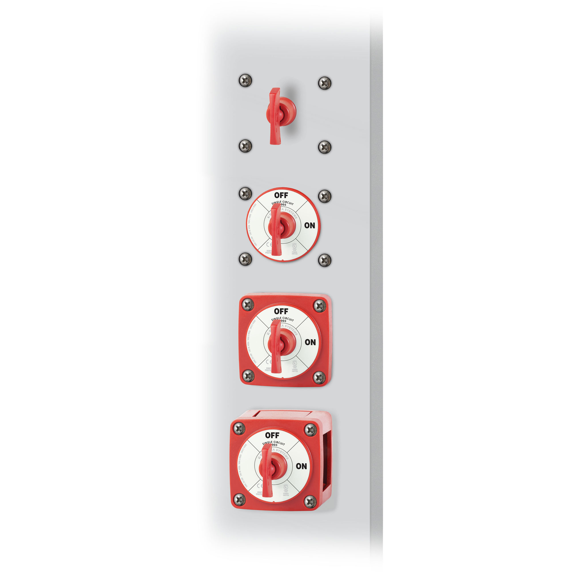 The BS6005 switches a single battery to a single load group. Safe for all outboard motors as well as small gasoline or diesel engines with ignition protection.