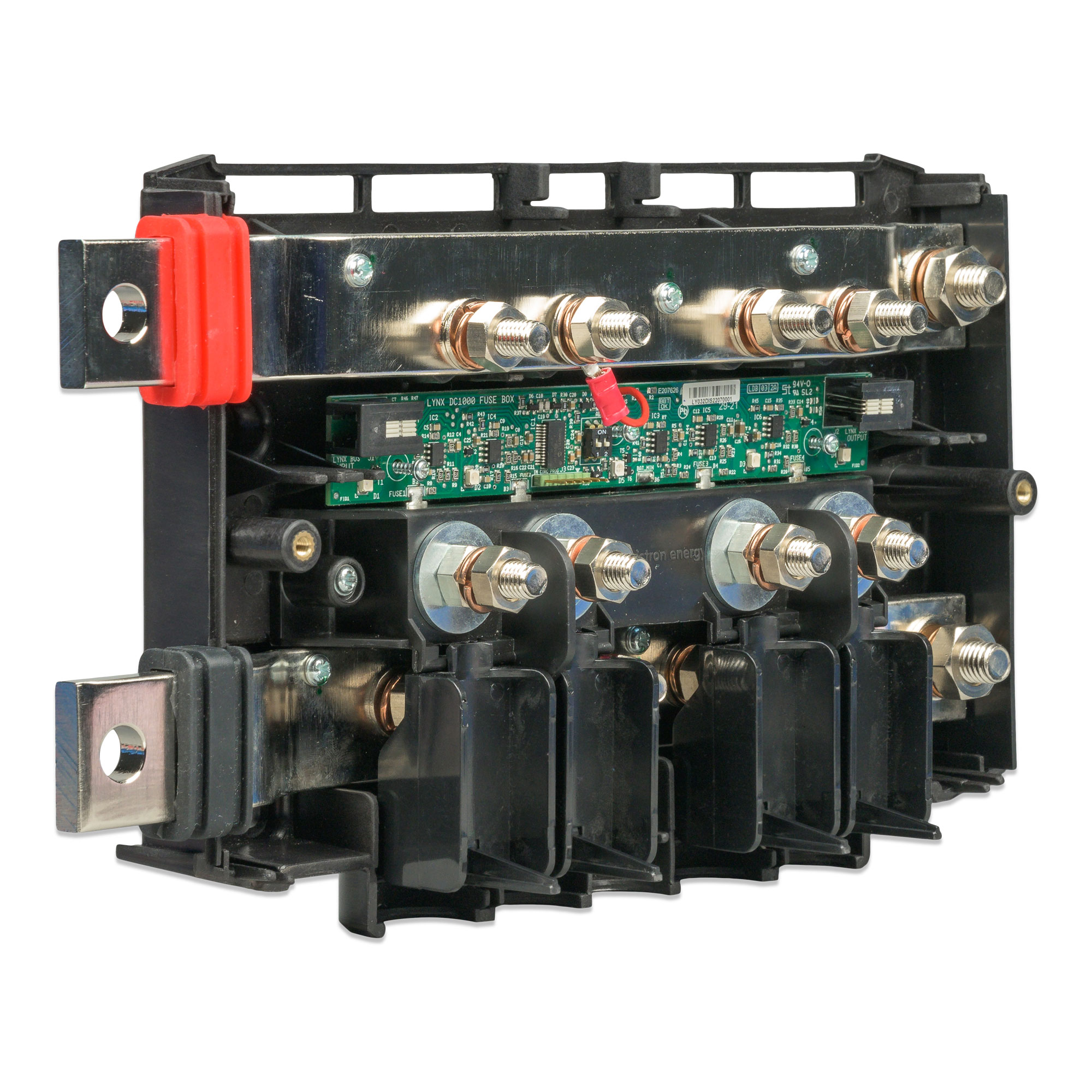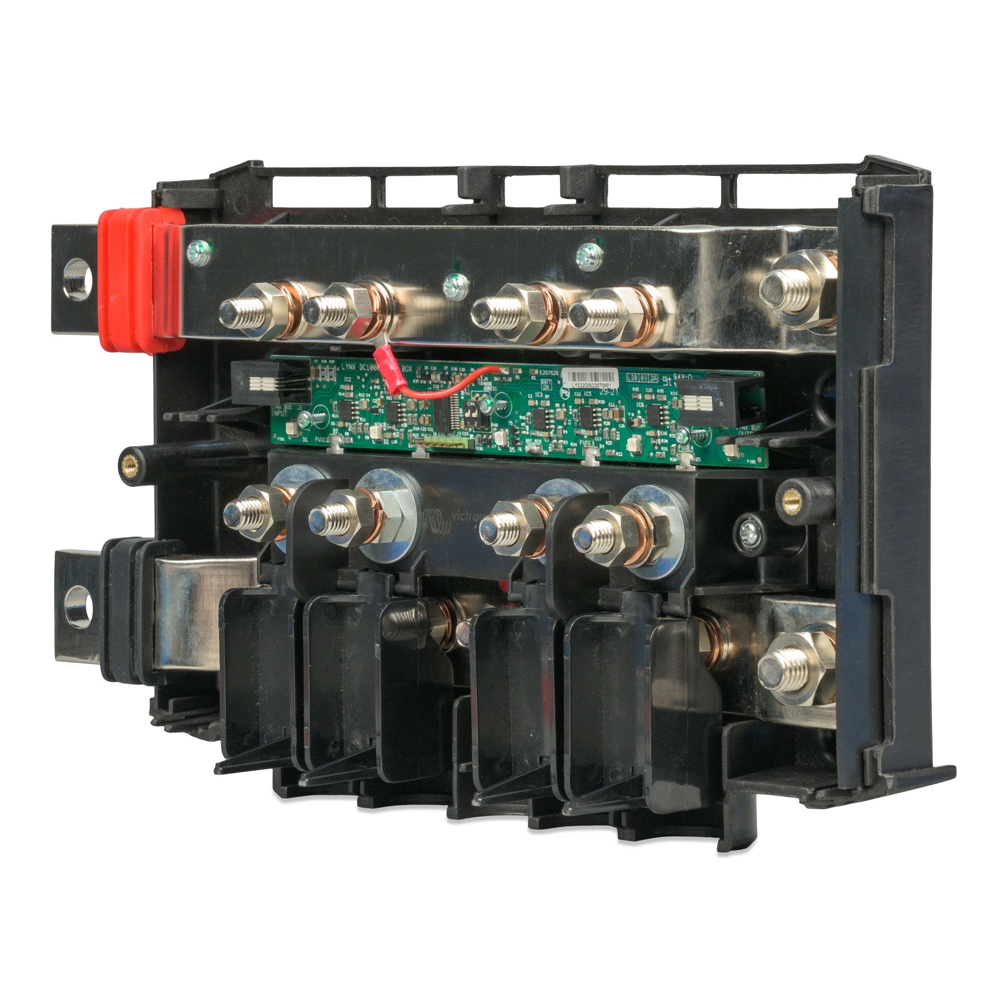 Une barre omnibus CC modulaire avec des emplacements pour quatre fusibles CC. Elle contrôle l’état de chaque fusible, et elle indique son état avec une LED sur la face avant. Le Lynx Distributor fait partie du système de distribution modulaire Lynx, disponible en modèles M8 et M10.